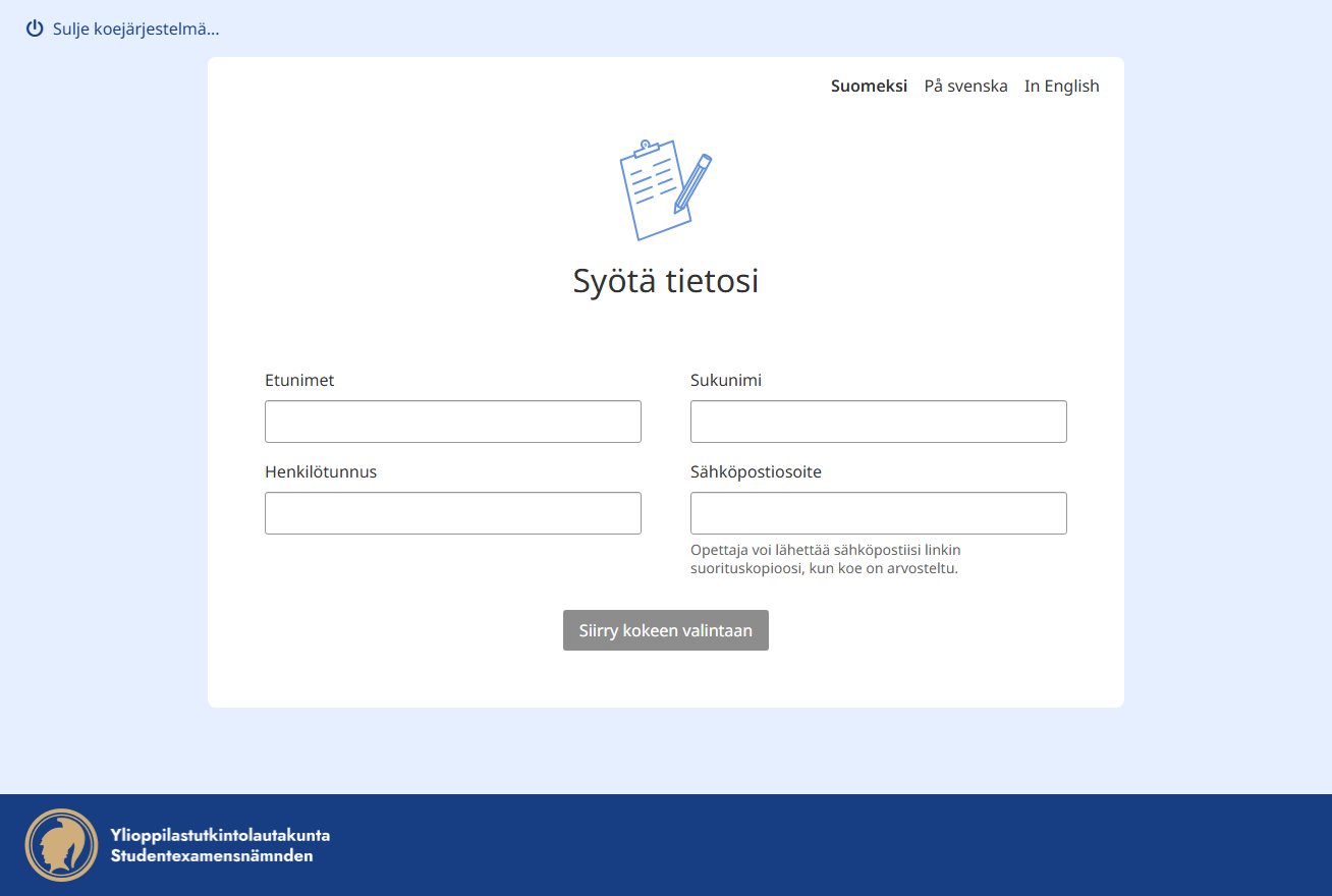 Huomaa! Ylioppilaskokeessa erillistä tietokonetta saavat käyttää vain erityisjärjestelypäätöksen saaneet kokelaat. Lue lisää erityisjärjestelyistä
