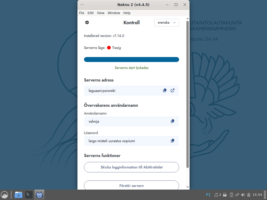 Försök sedan starta Abitti 2-servern på vanligt sätt. Om problem kvarstår, skicka först loggfilerna till Abitti-stödet via Naksu 2 och meddela därefter filnamnet som Naksu 2 gav samt beskriv problemet i ett e-postmeddelande.