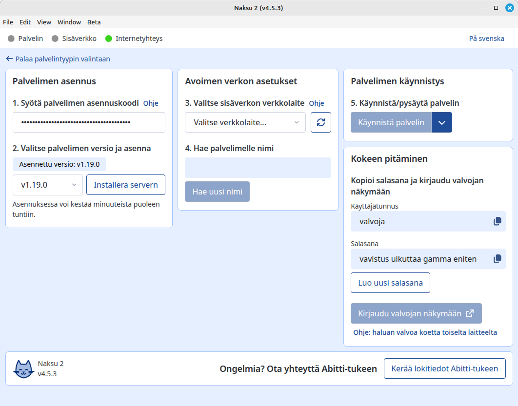 Asetukset kannattaa tehdä numerojärjestyksessä. Ensimmäisenä syötetään asennuskoodi sekä ladataan ja asennetaan palvelin.