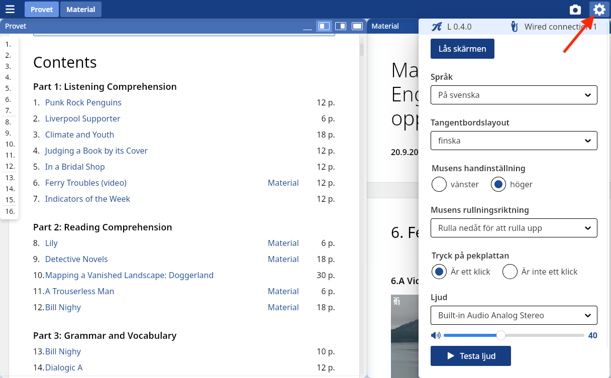 - Medan du väntar på att övervakaren startar provet kan du justera datorns inställningar enligt dina önskemål. Du kan också ändra dem under provet. Öppna inställningarna genom att klicka på kugghjulet uppe till höger.