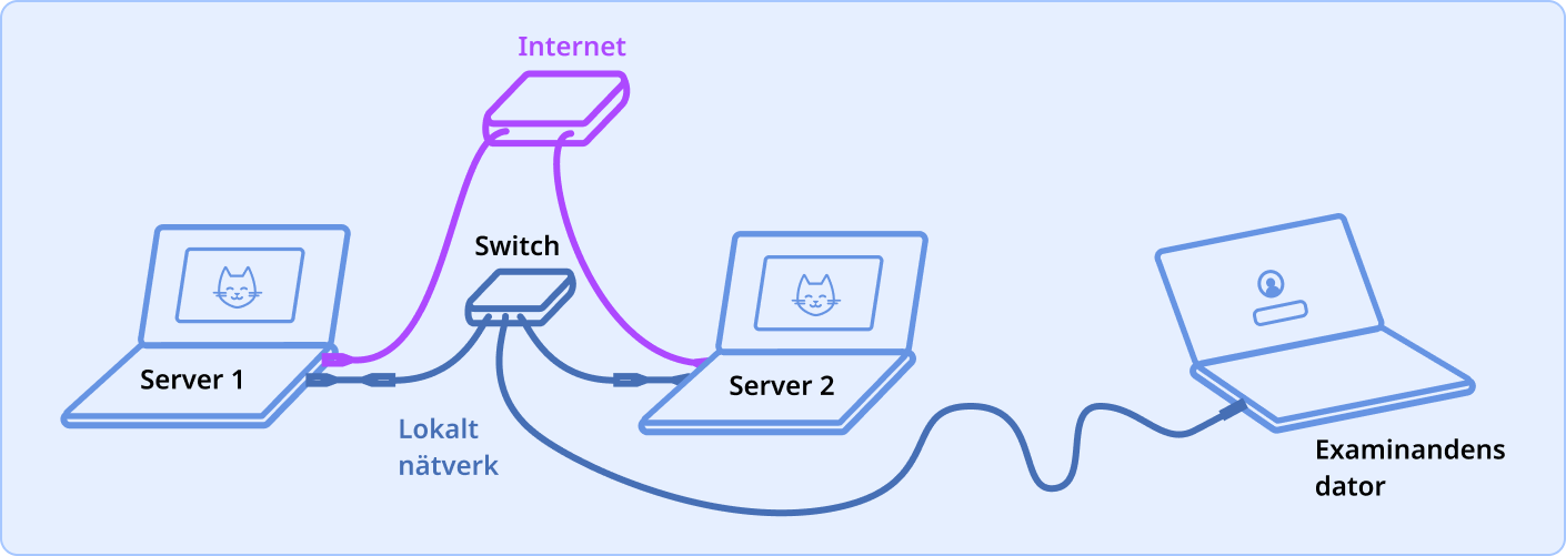 För övningsprov kan du vid behov använda endast en server. Observera då att provprestationer kan gå förlorade om servern får ett fel. I studentproven finns krav på serverkapacitet och antal servrar, se ylioppilastutkinto.fi.
