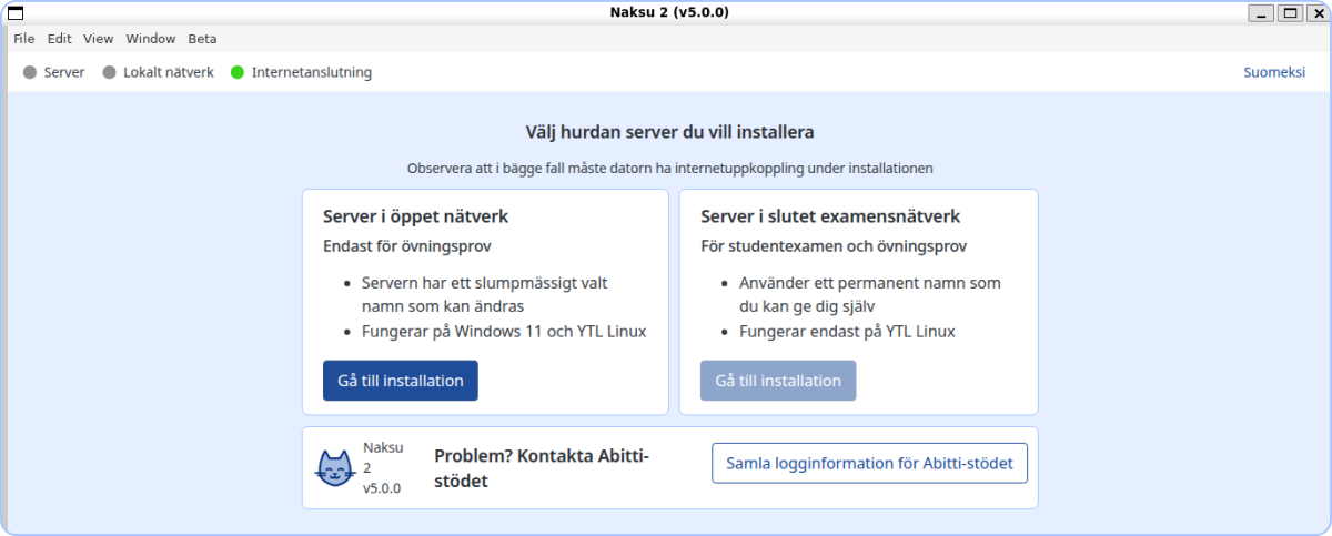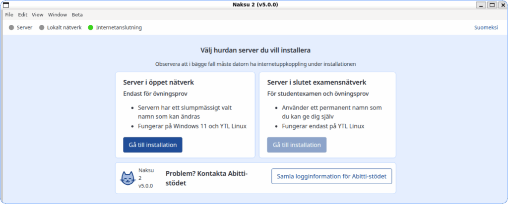 Naksu 2 ber dig välja om du installerar servern för öppet nät eller servern för det slutna examensnätet. Välj det första alternativet.