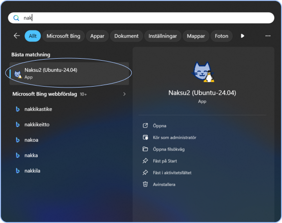13. I Windows programmeny finns nu programmet ”Naksu 2 (Ubuntu 24.04)” som du använder för att installera serverprogramvaran.
