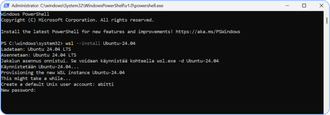 9. Datorn ber dig nu skapa ett Linux‑användarkonto och lösenord (”Create a default Unix user account”). Du kan använda ett allmänt konto, till exempel abitti. Tryck Enter. Ange sedan lösenordet (”New password”), till exempel abitti. Om datorn inte automatiskt ber dig skapa användarkonto, sök efter ”WSL” i startmenyn och starta det.