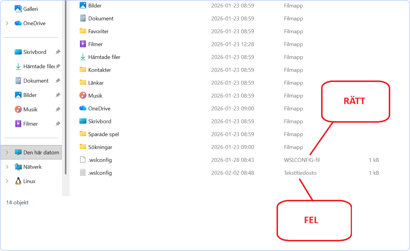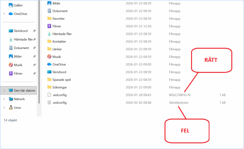 Kontrollera först att du inte av misstag skapade en vanlig textfil (i stället för en wslconfig‑fil) i hemkatalogen i det skede då du angav hur mycket minne servern får använda. (Se ”Förbered Windows för installation”, punkt 3.) Kontrollera att filen har namnet ”WSLCONFIG”, som på bilden nedan. Om filen ser korrekt ut men installationen ändå misslyckas, kontakta Abitti‑stödet.