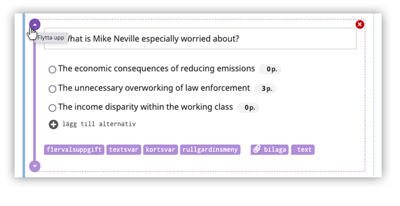 Till vänster om varje uppgift eller deluppgift finns pilar för uppåt och nedåt. Genom att klicka på pilarna kan du flytta uppgifterna. I den visuella editorn kan du inte flytta deluppgifter mellan olika uppgifter. För att t.ex. flytta uppgift 2.1 till uppgift 1.1 behöver du använda kodeditorn.
