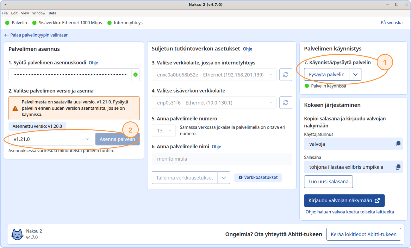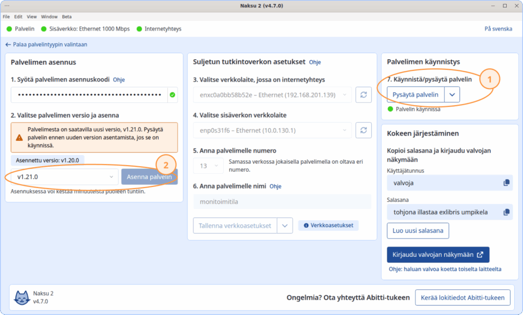 Naksu 2 ilmoittaa, kun palvelimesta on saatavilla uusi versio. Pysäytä ensin palvelin (kuvan kohta 1). Tarkista sitten, että alasvetovalikosta (kuvan kohta 2) on valittuna palvelimen uusin versio, ja klikkaa “Asenna palvelin” -painiketta.